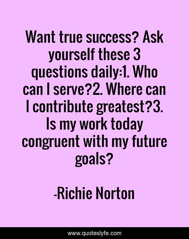 This page presents the quote "Want true success? Ask yourself these 3 questions daily:1. Who can I serve?2. Where can I contribute greatest?3. Is my work today congruent with my future goals?". Author of this quote is Richie Norton. .