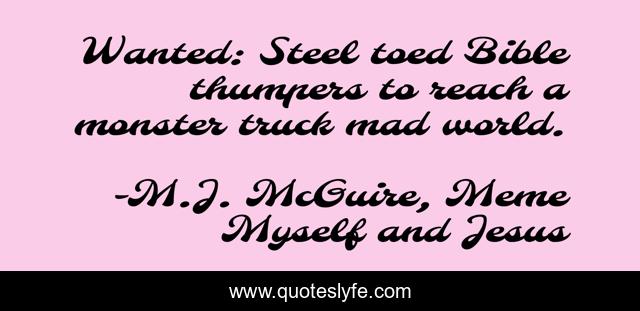 This page presents the quote "Wanted: Steel toed Bible thumpers to reach a monster truck mad world.". Author of this quote is M.J. McGuire, Meme Myself and Jesus. This quote is about funny, bible, humor, monster-trucks, evangelism, comedy, parody,.
