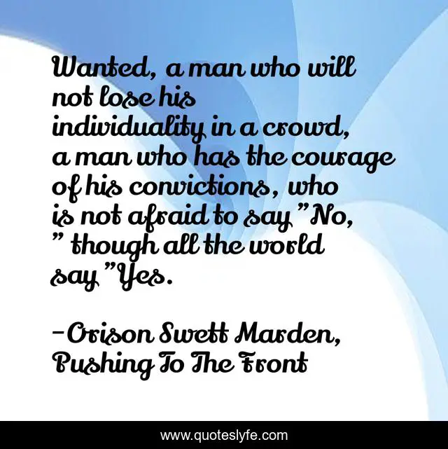 This page presents the quote "Wanted, a man who will not lose his individuality in a crowd, a man who has the courage of his convictions, who is not afraid to say "No, " though all the world say "Yes.". Author of this quote is Orison Swett Marden, Pushing To The Front. This quote is about convictions, morality,.