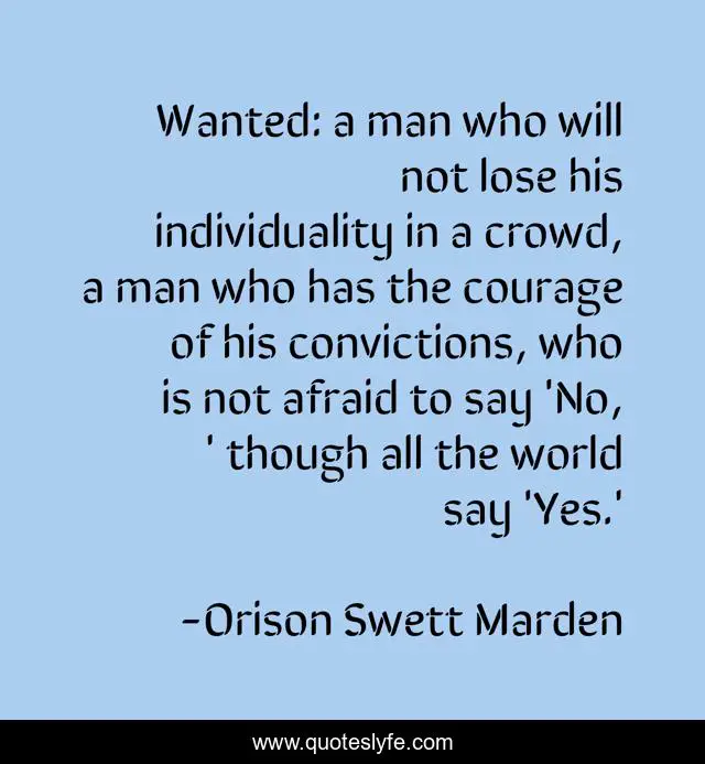 This page presents the quote "Wanted: a man who will not lose his individuality in a crowd, a man who has the courage of his convictions, who is not afraid to say 'No, ' though all the world say 'Yes.'". Author of this quote is Orison Swett Marden. This quote is about world, man,.