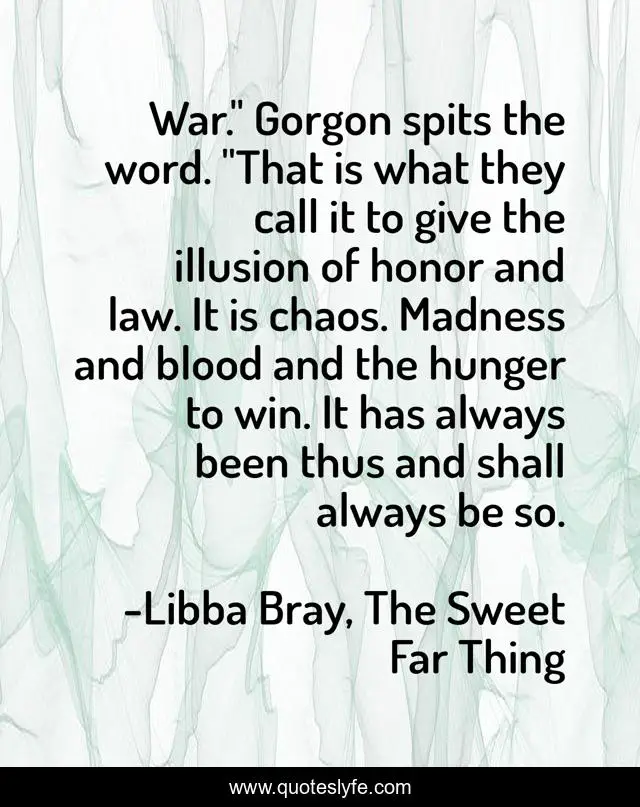 This page presents the quote "War." Gorgon spits the word. "That is what they call it to give the illusion of honor and law. It is chaos. Madness and blood and the hunger to win. It has always been thus and shall always be so.". Author of this quote is Libba Bray, The Sweet Far Thing. This quote is about forever, win, gorgon, chaos, war, law, honor,.