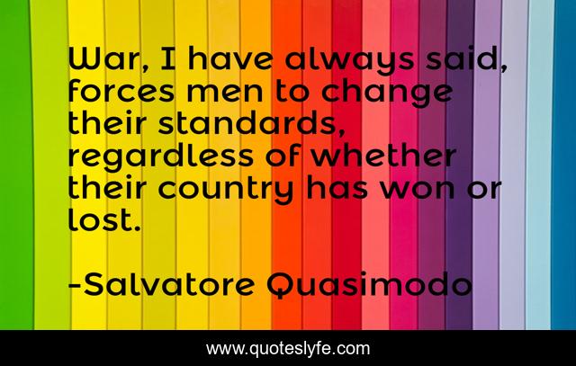 This page presents the quote "War, I have always said, forces men to change their standards, regardless of whether their country has won or lost.". Author of this quote is Salvatore Quasimodo. This quote is about men, change, lost,.