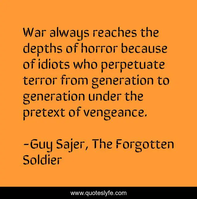 This page presents the quote "War always reaches the depths of horror because of idiots who perpetuate terror from generation to generation under the pretext of vengeance.". Author of this quote is Guy Sajer, The Forgotten Soldier. This quote is about world-war-ii, timeless, soldier, vengeance, terror, war,.