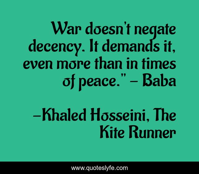 This page presents the quote "War doesn't negate decency. It demands it, even more than in times of peace." - Baba". Author of this quote is Khaled Hosseini, The Kite Runner. This quote is about war, morality,.
