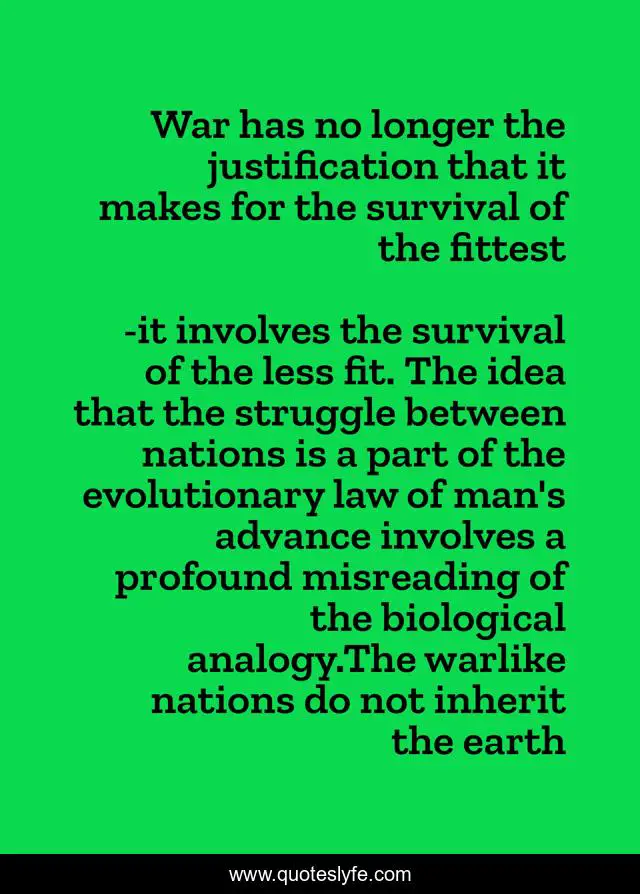 "it involves the survival of the less fit. The idea that the struggle between nations is a part of the evolutionary law of man's advance involves a profound misreading of the biological analogy.The warlike nations do not inherit the earth Quotes." Quoteslyfe.com, 2025. Fri. 05 Dec. 2025. <https://www.quoteslyfe.com/quote/War-has-no-longer-the-justification-that-189748>.