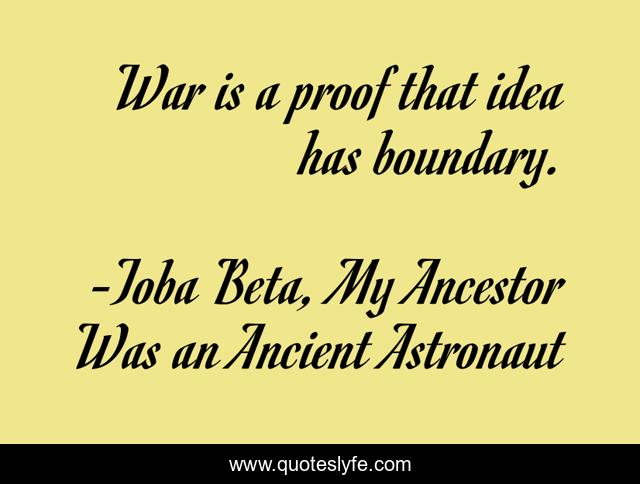This page presents the quote "War is a proof that idea has boundary.". Author of this quote is Toba Beta, My Ancestor Was an Ancient Astronaut. This quote is about boundary, proof, war, idea,.