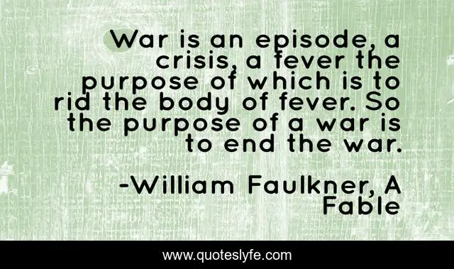 This page presents the quote "War is an episode, a crisis, a fever the purpose of which is to rid the body of fever. So the purpose of a war is to end the war.". Author of this quote is William Faulkner, A Fable. .