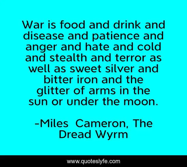 This page presents the quote "War is food and drink and disease and patience and anger and hate and cold and stealth and terror as well as sweet silver and bitter iron and the glitter of arms in the sun or under the moon.". Author of this quote is Miles Cameron, The Dread Wyrm. .