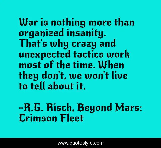 This page presents the quote "War is nothing more than organized insanity. That's why crazy and unexpected tactics work most of the time. When they don't, we won't live to tell about it.". Author of this quote is R.G. Risch, Beyond Mars: Crimson Fleet. This quote is about crazy, unexpected, tactics, fighting, insanity, war,.