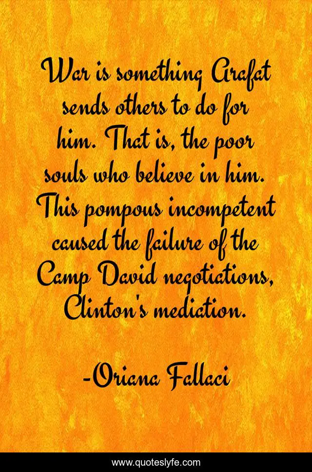This page presents the quote "War is something Arafat sends others to do for him. That is, the poor souls who believe in him. This pompous incompetent caused the failure of the Camp David negotiations, Clinton's mediation.". Author of this quote is Oriana Fallaci. This quote is about poor, believe, war,.