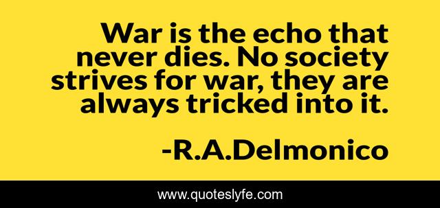 This page presents the quote "War is the echo that never dies. No society strives for war, they are always tricked into it.". Author of this quote is R.A.Delmonico. This quote is about society, war,.