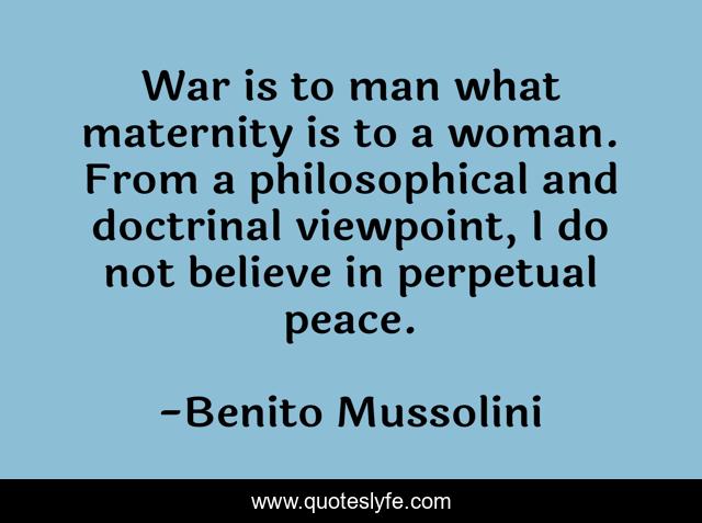 This page presents the quote "War is to man what maternity is to a woman. From a philosophical and doctrinal viewpoint, I do not believe in perpetual peace.". Author of this quote is Benito Mussolini. This quote is about woman, peace, man,.
