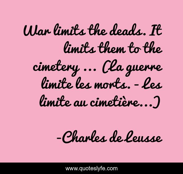 This page presents the quote "War limits the deads. It limits them to the cimetery ... (La guerre limite les morts. - Les limite au cimetière...)". Author of this quote is Charles de Leusse. This quote is about cimetière, guerre, dead, cimetery, mort, war,.