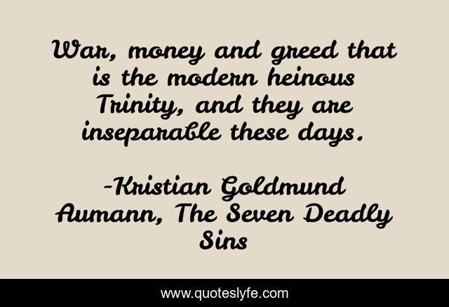 This page presents the quote "War, money and greed that is the modern heinous Trinity, and they are inseparable these days.". Author of this quote is Kristian Goldmund Aumann, The Seven Deadly Sins. This quote is about money, war, greed,.
