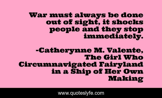 This page presents the quote "War must always be done out of sight, it shocks people and they stop immediately.". Author of this quote is Catherynne M. Valente, The Girl Who Circumnavigated Fairyland in a Ship of Her Own Making. .