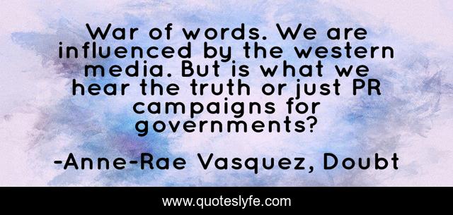 This page presents the quote "War of words. We are influenced by the western media. But is what we hear the truth or just PR campaigns for governments?". Author of this quote is Anne-Rae Vasquez, Doubt. This quote is about among-us, anne-rae-vasquez, truth-seekers, thoughts, quote,.