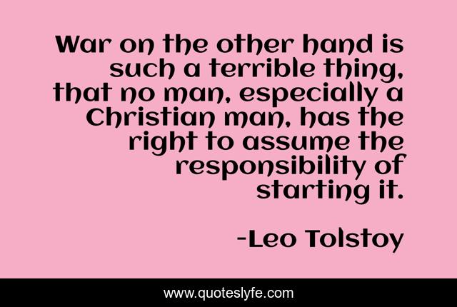 This page presents the quote "War on the other hand is such a terrible thing, that no man, especially a Christian man, has the right to assume the responsibility of starting it.". Author of this quote is Leo Tolstoy. This quote is about responsibility, man,.