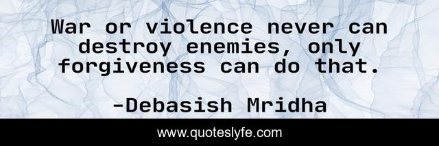 This page presents the quote "War or violence never can destroy enemies, only forgiveness can do that.". Author of this quote is Debasish Mridha. This quote is about life, debasish, violence, mridha, philosophy, destroy, forgiveness, war, enemies,.
