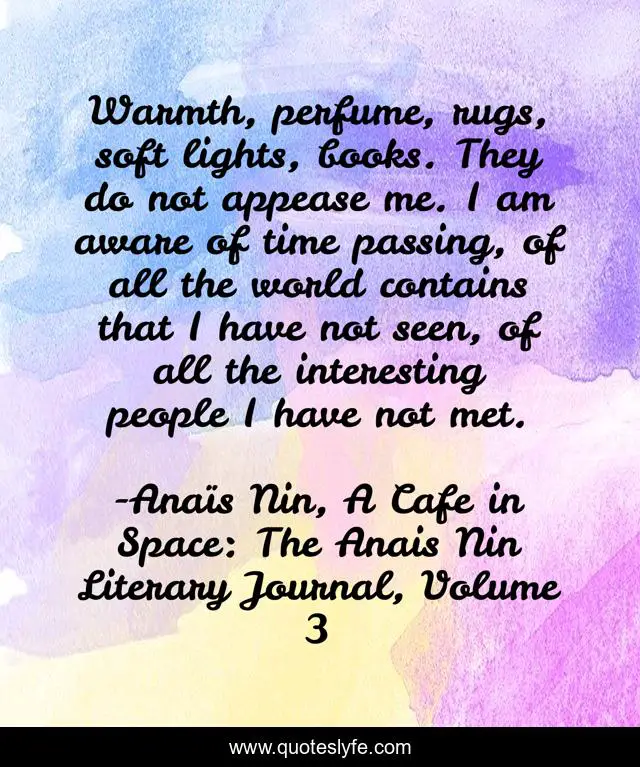 "Anaïs Nin, A Cafe in Space: The Anais Nin Literary Journal, Volume 3 Quotes." Quoteslyfe.com, 2025. Fri. 05 Dec. 2025. <https://www.quoteslyfe.com/quote/Warmth-perfume-rugs-soft-lights-books-They-242177>.