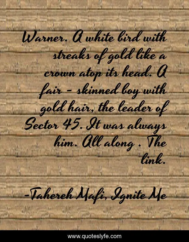 This page presents the quote "Warner. A white bird with streaks of gold like a crown atop its head. A fair - skinned boy with gold hair, the leader of Sector 45. It was always him. All along . The link.". Author of this quote is Tahereh Mafi, Ignite Me. This quote is about truelove, aaron, bird, fate, warner,.