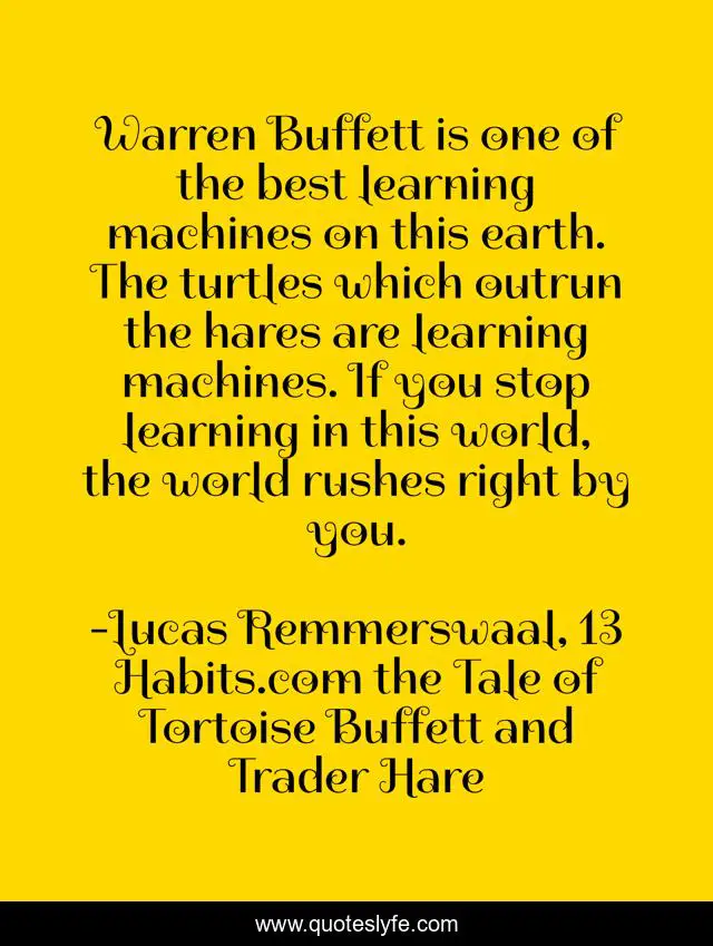 This page presents the quote "Warren Buffett is one of the best learning machines on this earth. The turtles which outrun the hares are learning machines. If you stop learning in this world, the world rushes right by you.". Author of this quote is Lucas Remmerswaal, 13 Habits.com the Tale of Tortoise Buffett and Trader Hare. This quote is about tortoise, turtles, warren-buffet, habits, 13-habits, learning, hares, charlie-munger,.