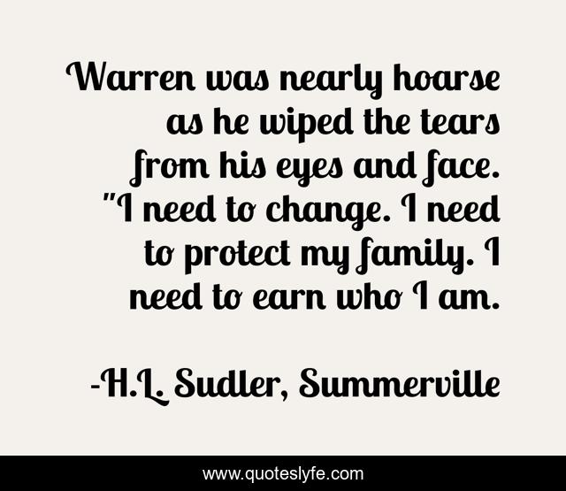 This page presents the quote "Warren was nearly hoarse as he wiped the tears from his eyes and face. "I need to change. I need to protect my family. I need to earn who I am.". Author of this quote is H.L. Sudler, Summerville. This quote is about thriller-novels, fiction,.
