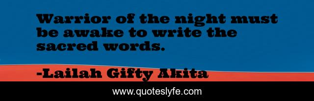 This page presents the quote "Warrior of the night must be awake to write the sacred words.". Author of this quote is Lailah Gifty Akita. This quote is about lailah-gifty-akita-affirmations, warriors, philosophy, writing, inspirational, enthusiasm, wonder,.