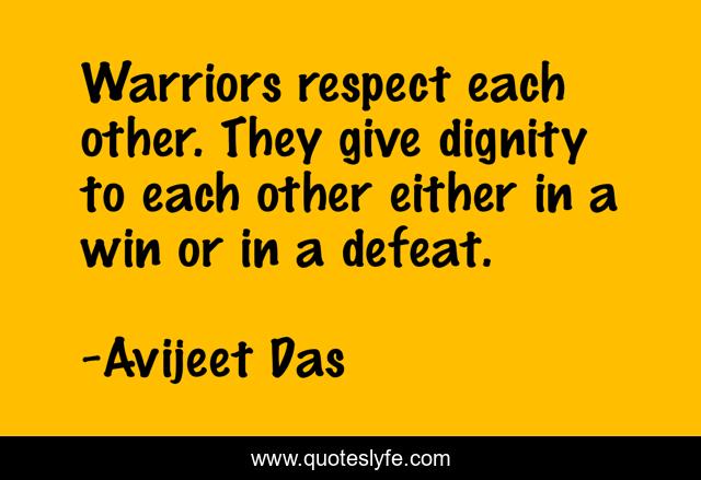 This page presents the quote "Warriors respect each other. They give dignity to each other either in a win or in a defeat.". Author of this quote is Avijeet Das. This quote is about dignity, life, respecting-others, writers-life, warriors, meaningful-life, dignity-isn-t-pride, winning, respecting-yourself,.