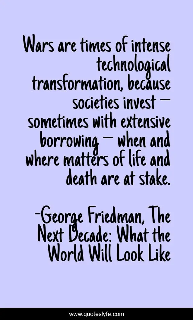 This page presents the quote "Wars are times of intense technological transformation, because societies invest – sometimes with extensive borrowing – when and where matters of life and death are at stake.". Author of this quote is George Friedman, The Next Decade: What the World Will Look Like. This quote is about pressure, stress, technology, risk, innovation,.