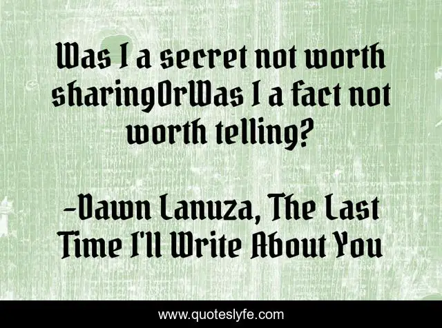 This page presents the quote "Was I a secret not worth sharingOrWas I a fact not worth telling?". Author of this quote is Dawn Lanuza, The Last Time I'll Write About You. This quote is about love, secrets, share, lies, affection, fact,.