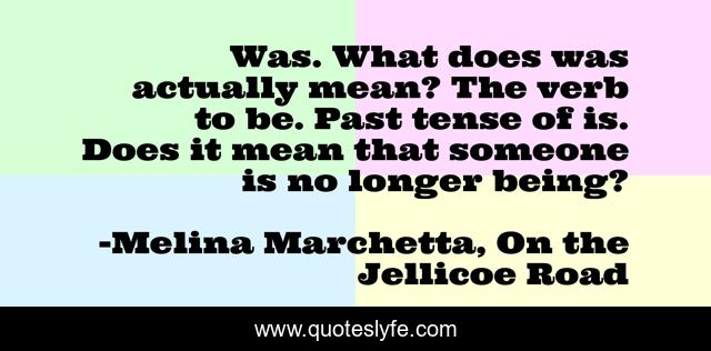 This page presents the quote "Was. What does was actually mean? The verb to be. Past tense of is. Does it mean that someone is no longer being?". Author of this quote is Melina Marchetta, On the Jellicoe Road. This quote is about life, death,.