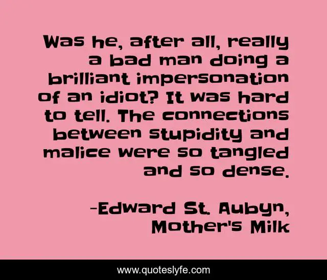 This page presents the quote "Was he, after all, really a bad man doing a brilliant impersonation of an idiot? It was hard to tell. The connections between stupidity and malice were so tangled and so dense.". Author of this quote is Edward St. Aubyn, Mother's Milk. This quote is about stupidity, seamus-dourke,.