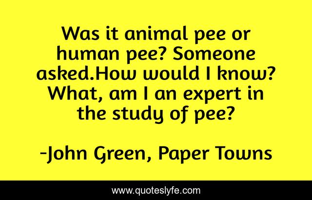 This page presents the quote "Was it animal pee or human pee? Someone asked.How would I know? What, am I an expert in the study of pee?". Author of this quote is John Green, Paper Towns. This quote is about funny, humor, paper, pee, towns, comedy,.