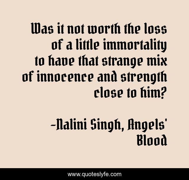 This page presents the quote "Was it not worth the loss of a little immortality to have that strange mix of innocence and strength close to him?". Author of this quote is Nalini Singh, Angels' Blood. This quote is about immortality, death, love, life, affection,.