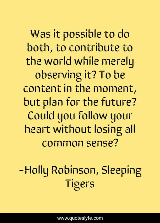 This page presents the quote "Was it possible to do both, to contribute to the world while merely observing it? To be content in the moment, but plan for the future? Could you follow your heart without losing all common sense?". Author of this quote is Holly Robinson, Sleeping Tigers. This quote is about giving, common-sense, contentment, giving-your-best,.