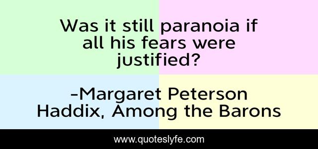 This page presents the quote "Was it still paranoia if all his fears were justified?". Author of this quote is Margaret Peterson Haddix, Among the Barons. This quote is about fear, paranoia,.