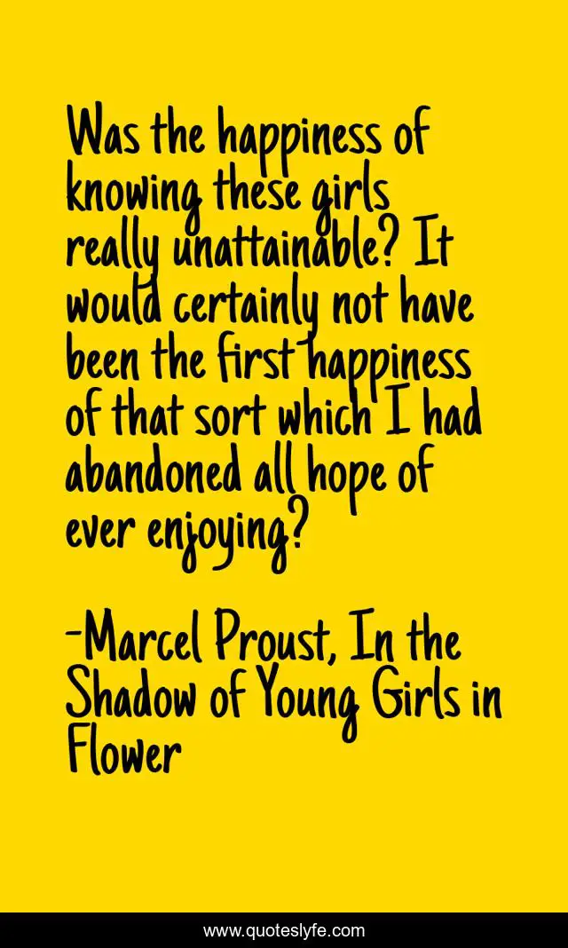 This page presents the quote "Was the happiness of knowing these girls really unattainable? It would certainly not have been the first happiness of that sort which I had abandoned all hope of ever enjoying?". Author of this quote is Marcel Proust, In the Shadow of Young Girls in Flower. This quote is about happiness, hope, unrequited-love,.