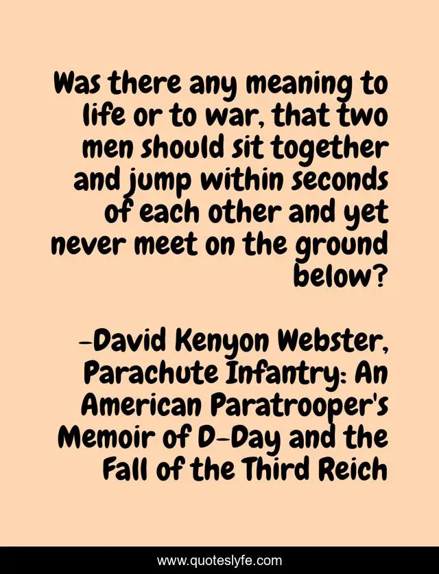 This page presents the quote "Was there any meaning to life or to war, that two men should sit together and jump within seconds of each other and yet never meet on the ground below?". Author of this quote is David Kenyon Webster, Parachute Infantry: An American Paratrooper's Memoir of D-Day and the Fall of the Third Reich. This quote is about death, war,.