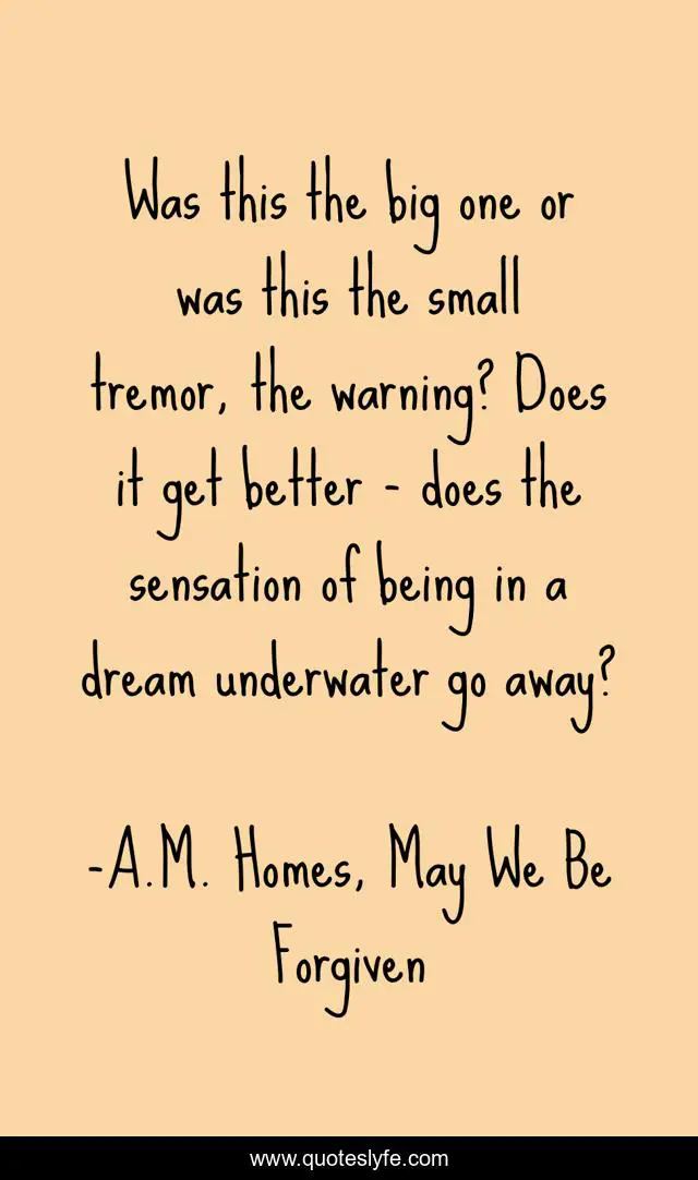 This page presents the quote "Was this the big one or was this the small tremor, the warning? Does it get better - does the sensation of being in a dream underwater go away?". Author of this quote is A.M. Homes, May We Be Forgiven. This quote is about reality, health, dreams, wonder,.