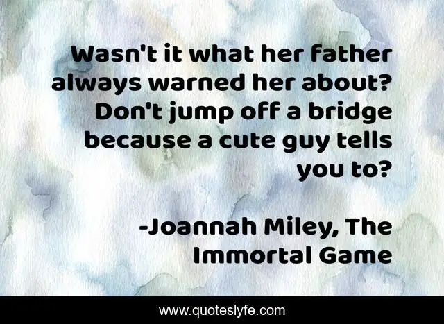 This page presents the quote "Wasn't it what her father always warned her about? Don't jump off a bridge because a cute guy tells you to?". Author of this quote is Joannah Miley, The Immortal Game. This quote is about thinking, funny, comedy, ruby,.