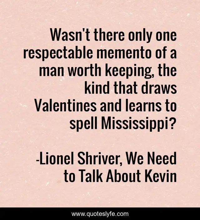 This page presents the quote "Wasn't there only one respectable memento of a man worth keeping, the kind that draws Valentines and learns to spell Mississippi?". Author of this quote is Lionel Shriver, We Need to Talk About Kevin. This quote is about family, death, love, children, affection,.