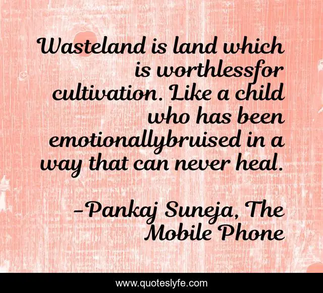 This page presents the quote "Wasteland is land which is worthlessfor cultivation. Like a child who has been emotionallybruised in a way that can never heal.". Author of this quote is Pankaj Suneja, The Mobile Phone. This quote is about heal, childhood, emotional-pain,.