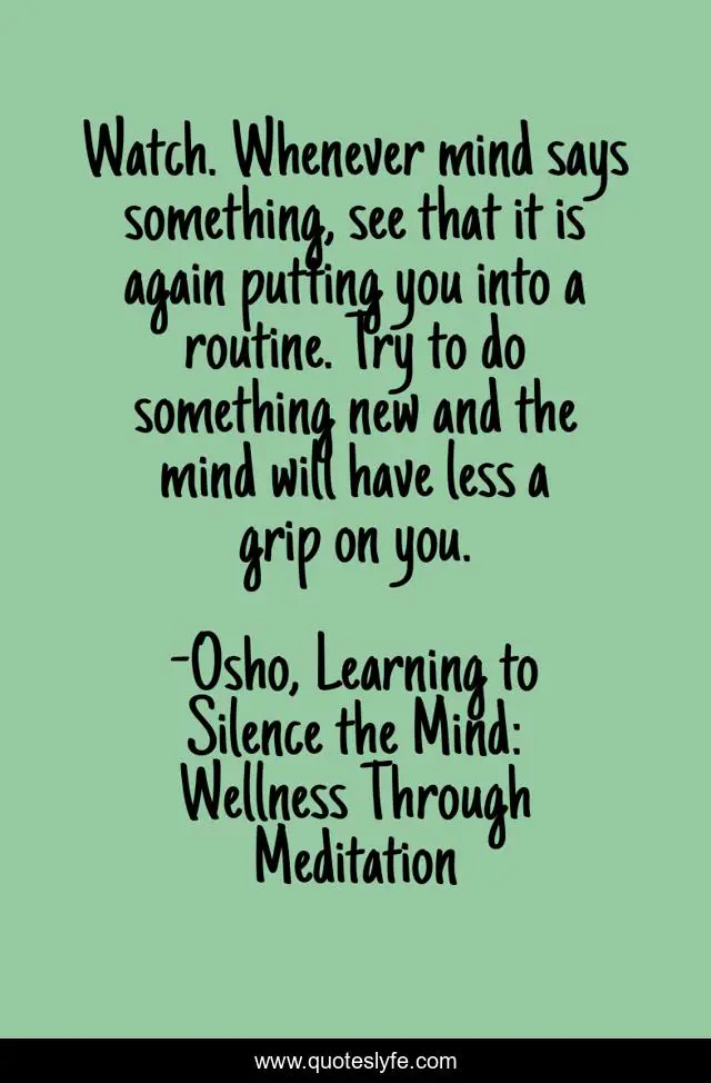 This page presents the quote "Watch. Whenever mind says something, see that it is again putting you into a routine. Try to do something new and the mind will have less a grip on you.". Author of this quote is Osho, Learning to Silence the Mind: Wellness Through Meditation. .