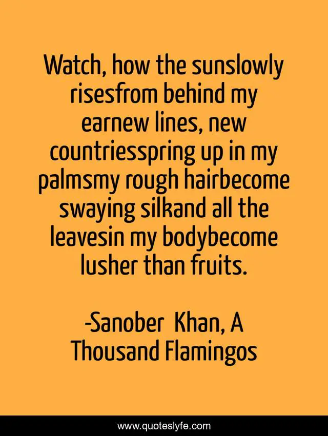 "Sanober Khan, A Thousand Flamingos Quotes." Quoteslyfe.com, 2025. Fri. 05 Dec. 2025. <https://www.quoteslyfe.com/quote/Watch-how-the-sunslowly-risesfrom-behind-my-66988>.