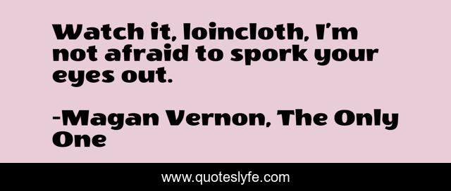 This page presents the quote "Watch it, loincloth, I’m not afraid to spork your eyes out.". Author of this quote is Magan Vernon, The Only One. This quote is about new-adult, college-romance, humor, the-only-one,.