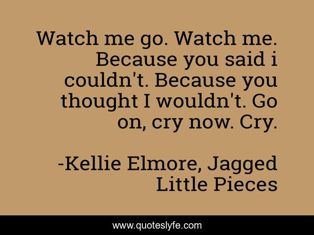 This page presents the quote "Watch me go. Watch me. Because you said i couldn't. Because you thought I wouldn't. Go on, cry now. Cry.". Author of this quote is Kellie Elmore, Jagged Little Pieces. This quote is about relationships, breaking-up, love, letting-go, words-to-inspire-you, poetry, free, couples, quotes,.