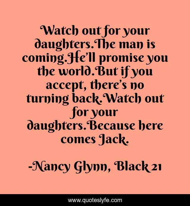 This page presents the quote "Watch out for your daughters.The man is coming.He’ll promise you the world.But if you accept, there’s no turning back.Watch out for your daughters.Because here comes Jack.". Author of this quote is Nancy Glynn, Black 21. This quote is about occult-romance, mystery-suspense, supernatural-thrillers, paranormal-romance,.