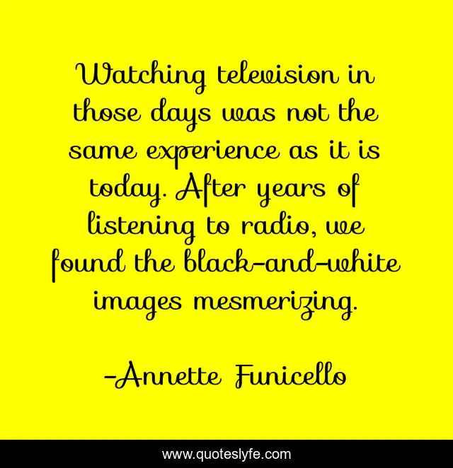 This page presents the quote "Watching television in those days was not the same experience as it is today. After years of listening to radio, we found the black-and-white images mesmerizing.". Author of this quote is Annette Funicello. This quote is about television, today, listening,.