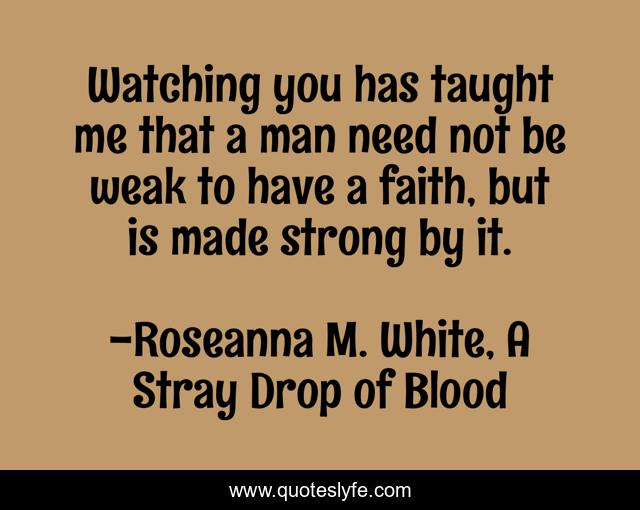 This page presents the quote "Watching you has taught me that a man need not be weak to have a faith, but is made strong by it.". Author of this quote is Roseanna M. White, A Stray Drop of Blood. This quote is about faith, weak,.
