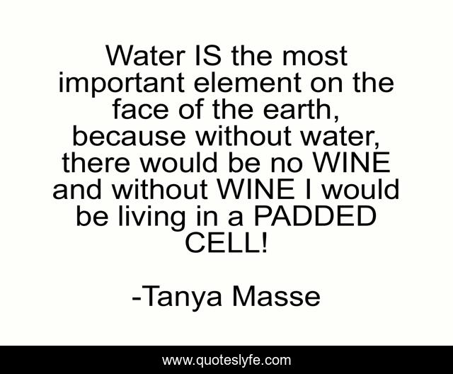 This page presents the quote "Water IS the most important element on the face of the earth, because without water, there would be no WINE and without WINE I would be living in a PADDED CELL!". Author of this quote is Tanya Masse. This quote is about quotes-about-life, wine-lovers, wine, wine-humor,.